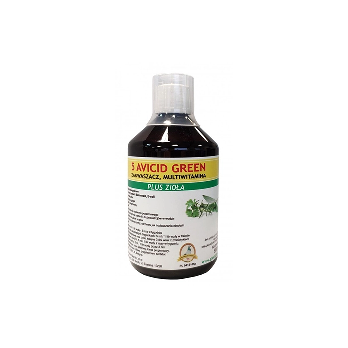 5 AVICID GREEN to wielofunkcyjny preparat o właściwościach przeciwbiegunkowych, stworzony w celu zapewnienia najwyższej higieny wody oraz wsparcia układu pokarmowego gołębi. Dzięki unikalnemu połączeniu kwasów organicznych, wyciągów ziół oraz kompleksu witamin, produkt ten skutecznie ogranicza rozwój szkodliwych bakterii i wspomaga ogólną witalność stada.