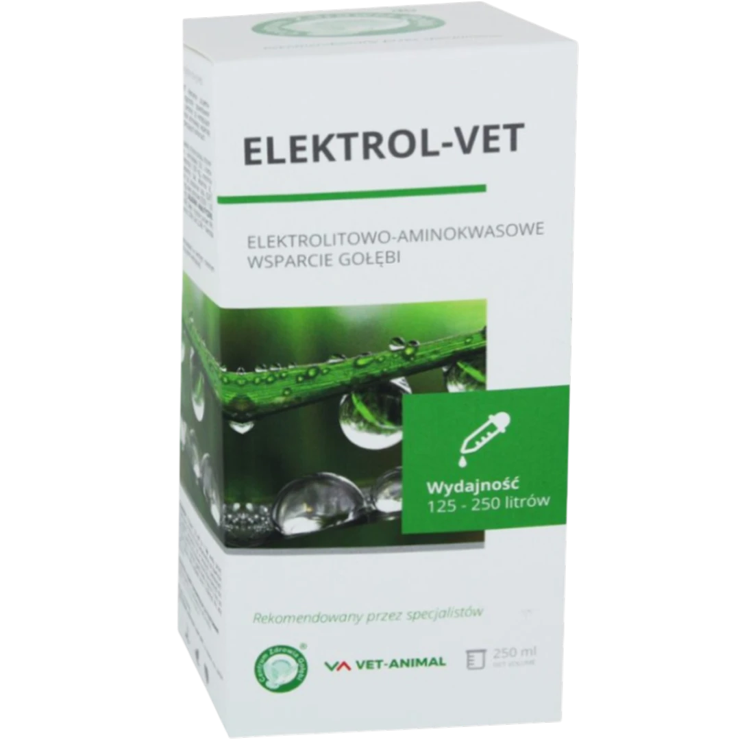 Elektrol-Vet 250ML to płynny preparat elektrolitowy dla gołębi, stworzony z myślą o szybkiej regeneracji organizmu po wysiłku, stresie i biegunkach. Uzupełnia niedobory elektrolitów i minerałów, wspierając równowagę wodno-elektrolitową, prawidłową pracę mięśni oraz odporność ptaków w wymagających okresach.