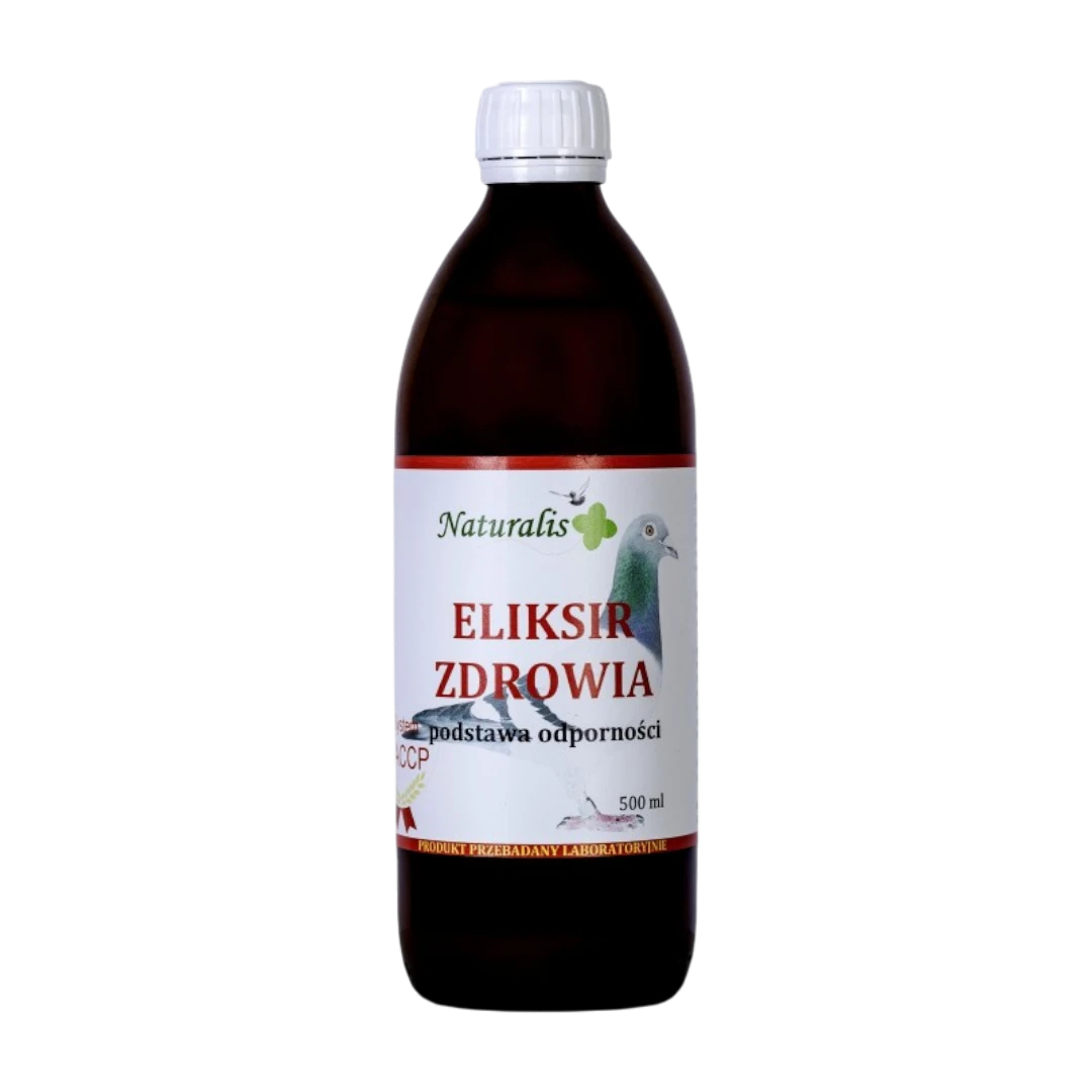 W 100% naturalny preparat wzmacniający odporność i wspierający zdrowie gołębi pocztowych. Eliksir Zdrowia łączy sok z warzyw, ocet jabłkowy z miodem i propolis w specjalnie dobranych proporcjach. Wspiera układ oddechowy i trawienny, poprawia witalność, zwiększa siłę i wytrzymałość oraz przyspiesza regenerację po odbytych lotach i chorobach.