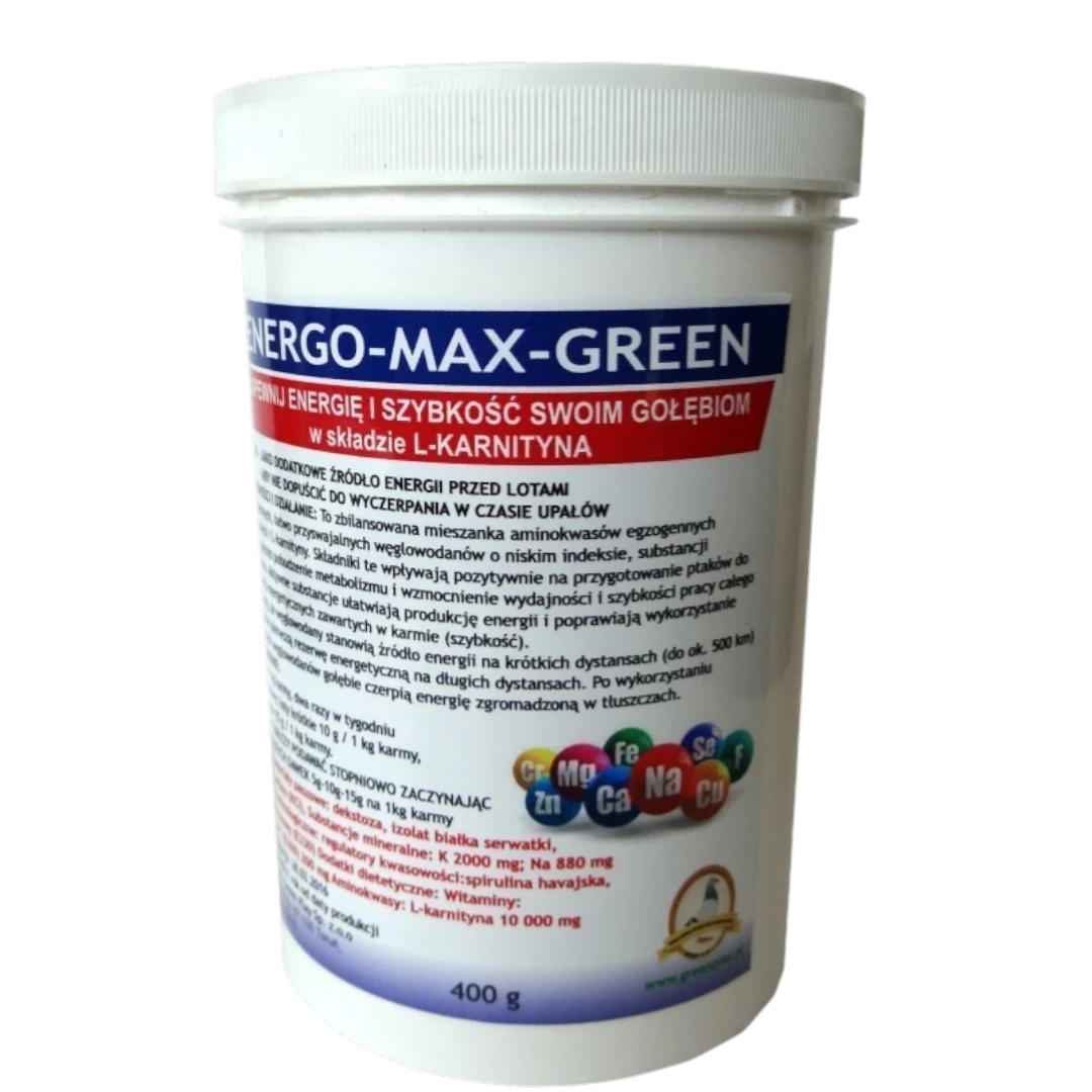 ENERGO-MAX-GREEN to precyzyjnie zbilansowana mieszanka aminokwasów (egzogennych i endogennych), substancji mineralnych, L-karnityny oraz łatwo przyswajalnych węglowodanów o niskim indeksie glikemicznym. Preparat został zaprojektowany, aby optymalnie przygotować gołębie do lotów poprzez pobudzenie metabolizmu i wzmocnienie wydajności pracy całego organizmu.