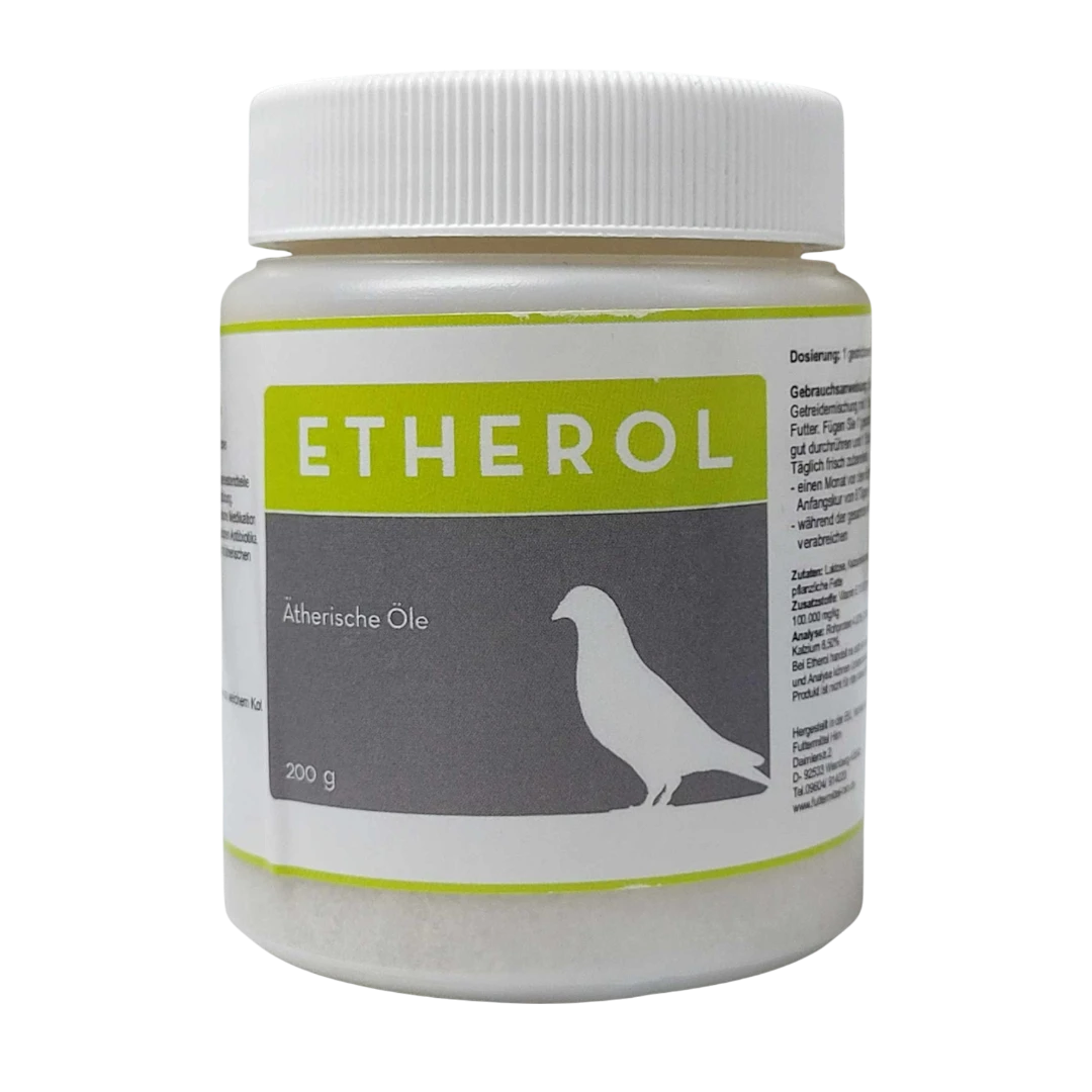Etherol marki Hirn to naturalny preparat w formie proszku, opierający swoje działanie na starannie dobranej mieszance substancji aromatycznych (olejków eterycznych) oraz wysokiej dawce witaminy E. Formuła ta została opracowana, aby wspierać funkcjonowanie organizmu gołębia na wielu poziomach, ze szczególnym uwzględnieniem układu oddechowego i odpornościowego. Regularne stosowanie produktu poprawia komfort oddychania ("czysta głowa"), co jest kluczowe dla osiągania stabilnych wyników lotowych, a także wspomaga procesy trawienne i przyswajanie wartości odżywczych.