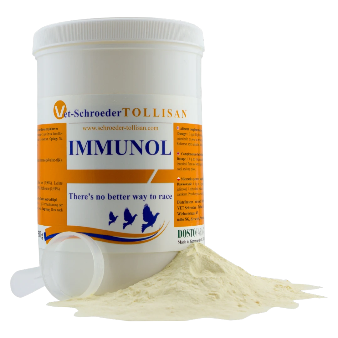 Immunol to innowacyjna mieszanka wysokowartościowego białka zwierzęcego oraz immunoglobulin (przeciwciał) z jaj w proszku. W przeciwieństwie do białek roślinnych, białko zwierzęce zawarte w Immunolu posiada profil aminokwasowy idealny dla gołębi, co pozwala na błyskawiczną regenerację mięśni po ciężkim locie (w ciągu 48 godzin). Dodatkowo, zawarte w preparacie immunoglobuliny działają w jelitach jak "tarcza", neutralizując bakterie E. coli i Salmonella, co czyni ten produkt kluczowym elementem w profilaktyce choroby młodych.