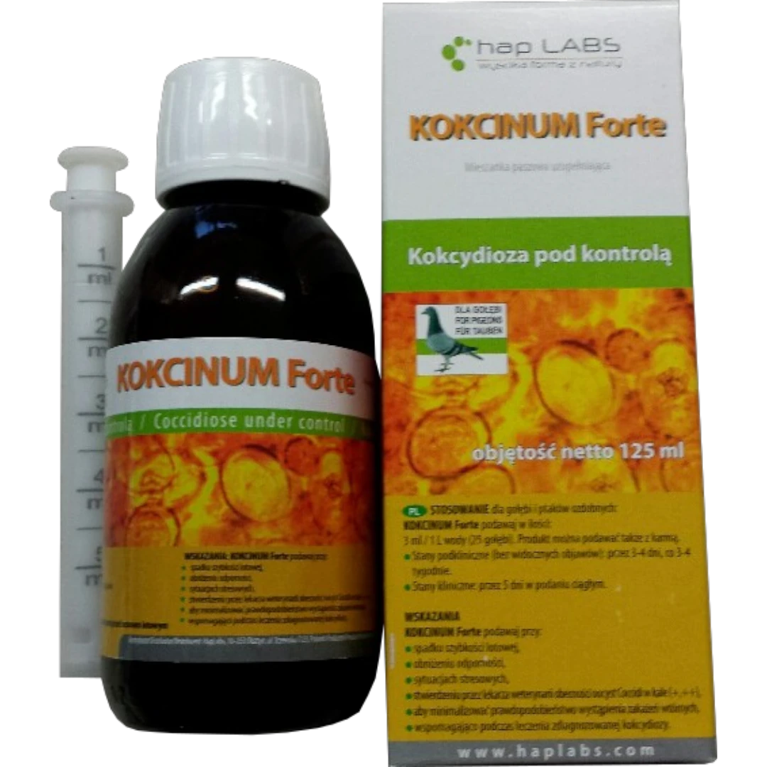 KOKCINUM FORTE to wysoce specjalistyczny, w 100% naturalny środek (nieantybiotykowy), opracowany w celu skutecznego zwalczania inwazji pierwotniaków z rzędu Coccidia (rodzaj Eimeria-sp.). Kokcydioza to jeden z najgroźniejszych czynników obniżających odporność i kondycję gołębi, co otwiera drogę do groźnych zakażeń wtórnych, takich jak Salmonelloza, Trichomonadoza czy wirusy (np. Circowiroza).