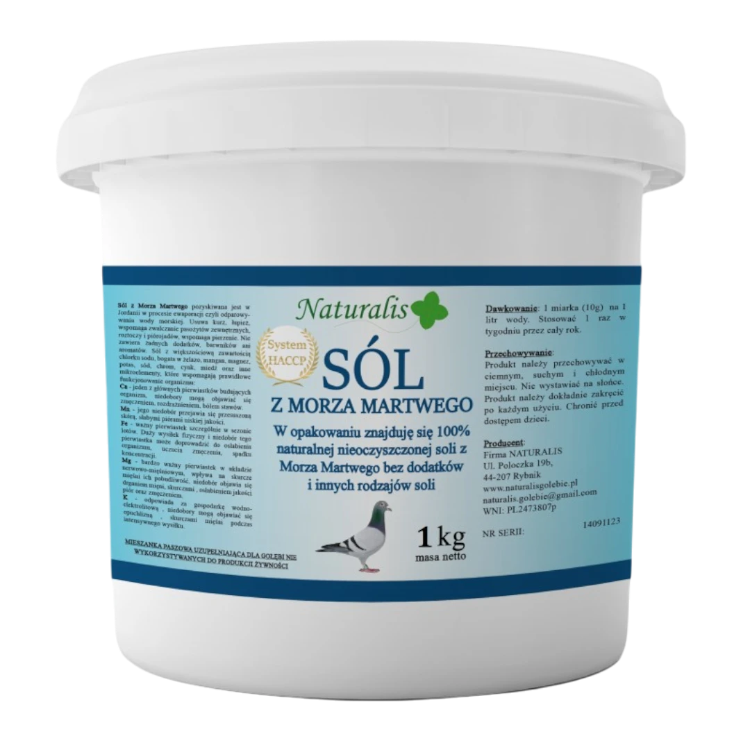 100% naturalna sól z Morza Martwego, pozyskiwana w procesie odparowywania wody morskiej. Wspomaga higienę i pielęgnację gołębi, usuwa kurz i łupież, działa przeciwpasożytniczo oraz wspiera proces pierzenia. Nie zawiera żadnych dodatków, barwników ani aromatów.