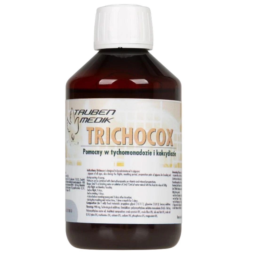 Trichocox marki Tauben Medik to specjalistyczny, płynny preparat stworzony z myślą o gołębiach pocztowych i rasowych w każdym wieku. Jest to niezwykle skuteczna mieszanka, która pozwala na skuteczne zwalczanie najczęstszych chorób pasożytniczych występujących w hodowlach, takich jak rzęsistek (żółty guzek), heksamitoza oraz kokcydioza. Dzięki bogatemu składowi, preparat błyskawicznie radzi sobie z pierwotniakami bytującymi w przewodzie pokarmowym ptaków.
