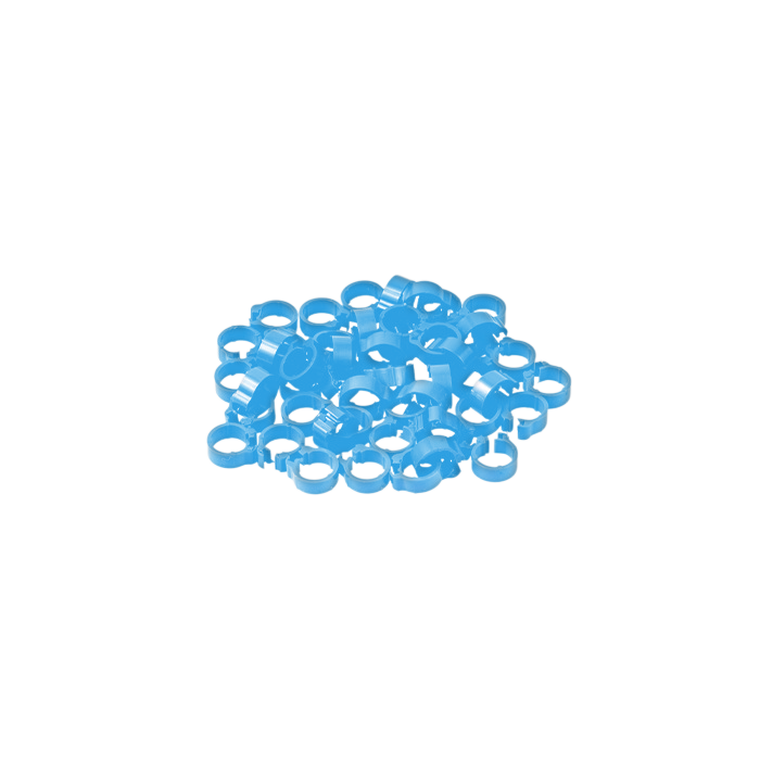 Zestaw 50 sztuk niebieskich, wąskich znaczników firmy Polmark. Lekkie i wytrzymałe, doskonałe do szybkiej identyfikacji gołębi podczas lotów, treningów i w hodowli.